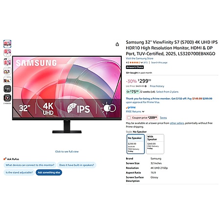 Samsung 32" ViewFinity S7 (S70D) 4K UHD IPS HDR10 High Resolution Monitor, HDMI & DP Port, TUV-Certified, 2025, LS32D700EBNXGO $209.99​ w/coupon