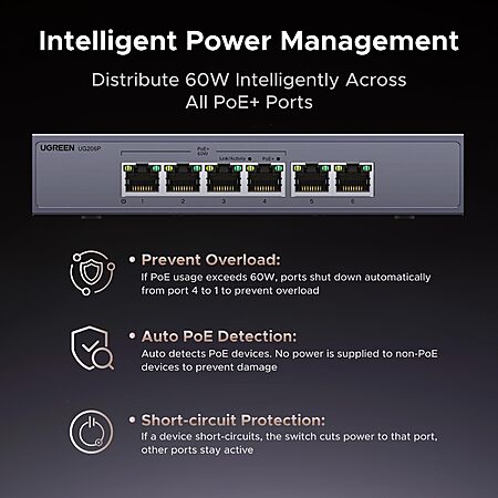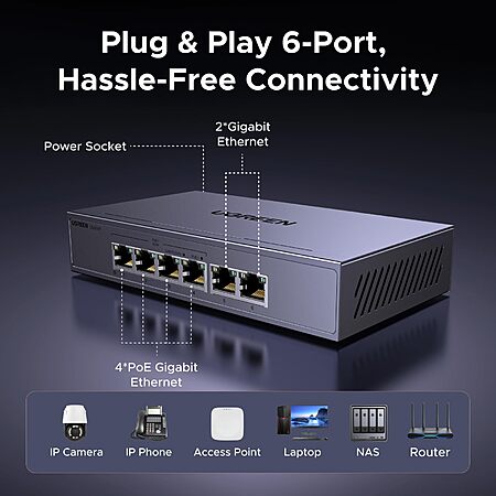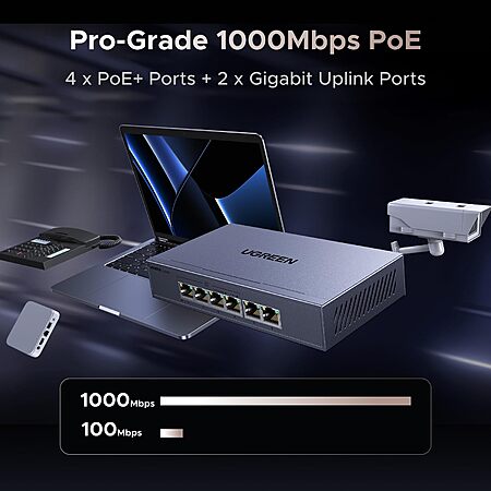 Model: UGREEN Ethernet Switch, 6 Port PoE Switch, 4 PoE+@60W and 2 Gigabit Uplink, Plug & Play, Auto/VLAN/Extend Mode, Sturdy Metal, Desktop or Wall Mount Network Splitter Hub for Security Camera, IP Phone