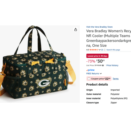 YMMV Vera Bradley Women's Recycled Lighten Up Nfl Cooler, Greenbaypackersondarkgreen/Yellowbandana, One Size $22.50 AC
