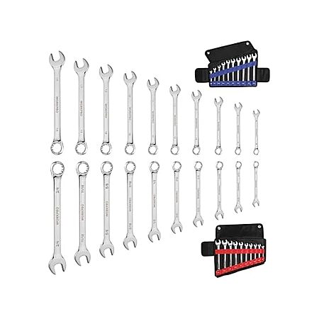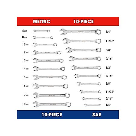 - Common Size Ranges: The Combination Wrench Set that meets ANSI standards includes 10 METRIC +10 SAE size: Metric 6 mm, 8 mm, 10 mm, 12 mm, 13 mm, 14 mm, 15 mm, 16 mm, 17 mm, 18 mm and SAE 1/4", 5/16", 11/32", 3/8", 7/16", 1/2", 9/16", 5/8", 11/16", 3/4"; Wrench size is stamped on both sides