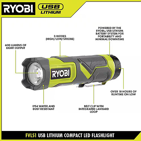 | Product Description: | RYOBI introduces the USB Lithium LED Compact Flashlight and Compact Area Light Kit with (2) Batteries and Charging Cables. With up to 600 Lumens of light output and 3 light modes, this flashlight provides bright, vivid light while still maintaining a durable, compact design. This flashlight provides 18 hours of runtime and is the perfect solution for dark enclosed workspaces, night-time recreation activities or emergency situations. The RYOBI USB Lithium LED Compact Area Light Kit provides illumination in a durable and space saving design. With up to 300 Lumens, this compact area light can easily light up any environment hands-free with folding metal hanging hook, included carabiner and RYOBI LINK Wall Storage compatibility. Best of all, it is part of the RYOBI USB Lithium System of tools that provides compact, rechargeable, everyday solutions for cordless power and productivity. This USB Lithium Kit is backed by the RYOBI 2-Year Manufacturer's Warranty and includes FVL51 Compact LED Flashlight, USB Lithium 2Ah Battery, USB Cable, FVL59 LED Compact Area Light, USB Lithium 2Ah Battery, USB Cable and Operator's Manual. Color: RYOBI Green. |