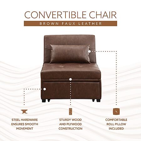 - Upholstered in a brown faux leather fabric that provides a bold accent in a variety of decor settings. Includes matching brown faux leather pillow.