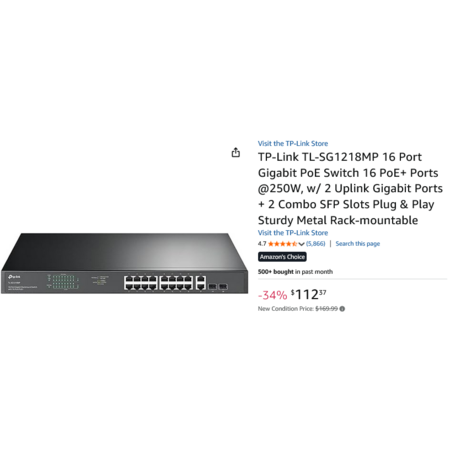 TP-Link TL-SG1218MP 16-Port Gigabit PoE Switch 16 PoE+ Ports @250W, w/2 Uplink Gigabit Ports+2 Combo SFP Slots. Used - Like New $112.37