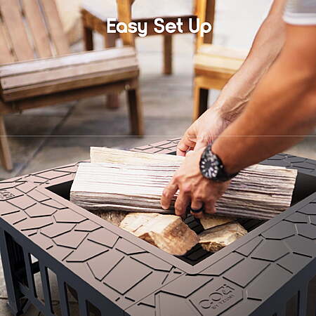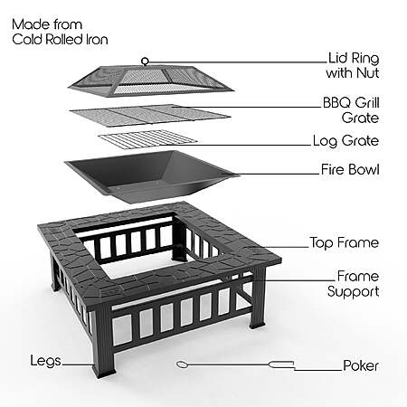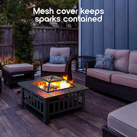 | Product Description: | Ready to cook up a feast? Enjoy the warmth and comfort of this fire pit, perfect for any outdoor gathering. Whether you're relaxing on the patio or camping in the woods, this fire pit brings cozy vibes to your space. It's easy to set up and includes everything you need for BBQ fun, grill cooking, or just enjoying the fire. With this fire pit, making memories outdoors has never been easier. Built for durability, our fire pits are made to last. They can handle the outdoors, whether you're using it at home or taking it along on your camping trips. The sturdy design makes it the perfect choice for an outdoor fireplace, able to withstand the elements while providing warmth season after season. It’s the ideal piece of outdoor decor to complete your backyard setup. Take your outdoor fun to the next level with the Cozi Square Fire Pit Table! Setting up the fire pit is simple, so you can start enjoying it right away. All the pieces fit together easily, and with the included instructions, you’ll have it ready in no time. Once it’s assembled, the fire pit provides a safe and easy way to enjoy an outdoor fireplace experience with family and friends. This fire pit also includes a BBQ grill grate for cooking your favorite meals. Simply swap out the mesh lid and place the grill on top to start cooking. The BBQ grill ensures even heat for great grilling, making it perfect for cooking everything from burgers to marshmallows. For added safety, the fire pit comes with a protective fire screen. This screen helps contain the fire and prevents flying embers from posing a risk to you or your surroundings. You can relax and enjoy the evening knowing the fire is safely contained, keeping your outdoor space protected while still providing the warmth and charm you want. Make your camping trips even more memorable. Buy Cozi Square Fire Pit Table today! 32” square fire pit table for camping and outdoor gatherings With BBQ grill included for a complete camping experience Durable steel, weather-resistant construction Burns coal or wood Easy to assemble (all hardware included) Includes mesh lid with handle, poker, BBQ grill grate, and tongs Product Dimensions – 32 x 32 x 18in, 27.5lbs |