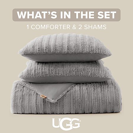 Amazon [amazon.com] has UGG Kenzie Full/Queen Comforter Set w/ 2 Pillow Shams Plush Bedding Warm Down Alternative (Seal Grey) for $81.97. Shipping is free.
