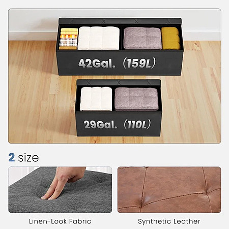 【Sturdy and Comfortable】: This storage ottoman bench is supported by thick MDF panels for excellent stability. The top is filled with high-density foam and covered with stylish gray linen fabric, ensuring both comfort and breathability. Ottoman bench can support a static weight of up to 660 pounds.