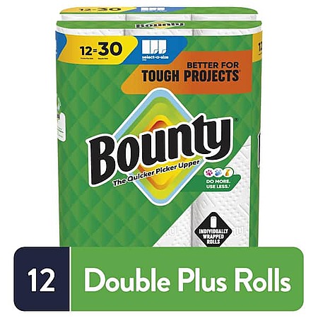 BOUNTY Select-A-Size Paper Towel Roll (12 Double Plus Rolls) x 3 = 90 Reg Rolls $68.94 or 4 for $87 Free Delivery Home Depot, Get a $15 Visa Prepaid P&G Rebate