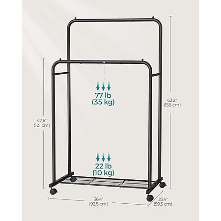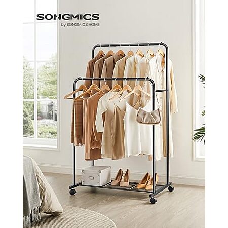 $33.99 | SONGMICS Double Rods Clothes Rack with Wheels, Black at Amazon