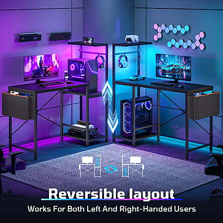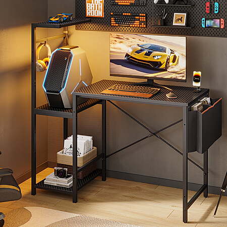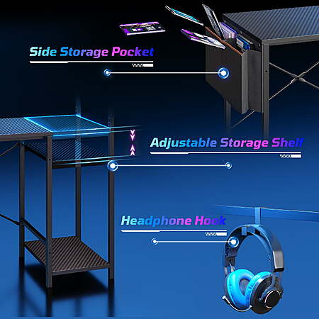 Model: Bestier Gaming Desk with LED Lights, 44'' Computer Desk with Reversible Shelves, PC Gamer Desk with Side Storage Bag, Hooks and Height Adjustable Shelf for Home Office, Carbon Fiber Black