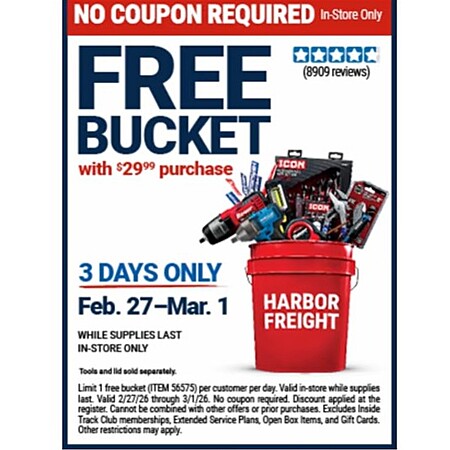 Harbor Freight ITC, FREE 5 gallon bucket with any purchase, non-ITC receive bucket with $29.99 purchase, Feb 27-Mar 1