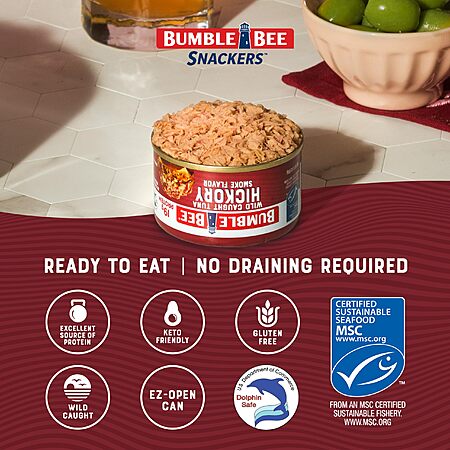 3-Oz Bumble Bee Snackers Wild Caught Skipjack Chunk Light Tuna w/ 19g Protein (Hickory Smoked Tuna) & More $.96 + Free Shipping w/ Prime or on $35+ $0.96