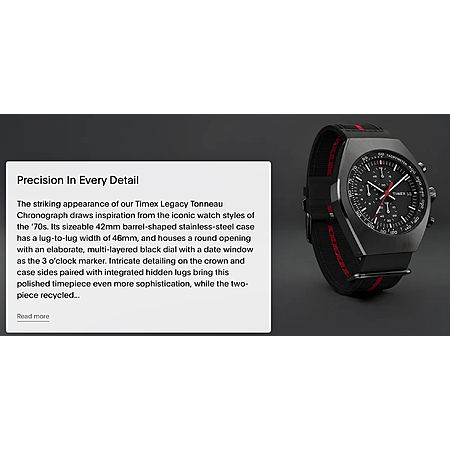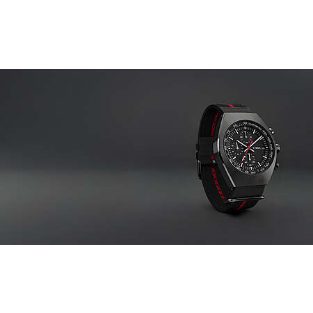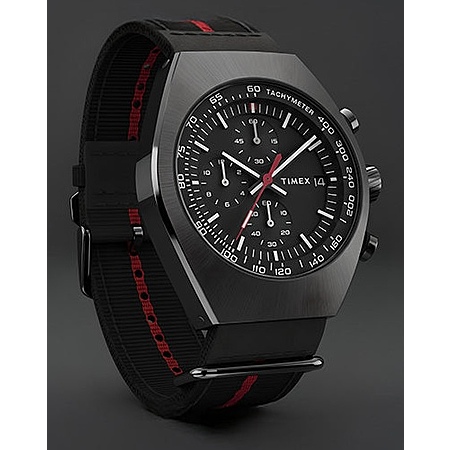 The striking appearance of our Timex Legacy Tonneau Chronograph draws inspiration from the iconic watch styles of the '70s. Its sizeable 42mm barrel-shaped stainless-steel case has a lug-to-lug width of 46mm, and houses a round opening with an elaborate, multi-layered black dial with a date window as the 3 o'clock marker. Intricate detailing on the crown and case sides paired with integrated hidden lugs bring this polished timepiece even more sophistication, while the two-piece recycled fabric strap with leather tabs at the spring bars completes its handsome profile.