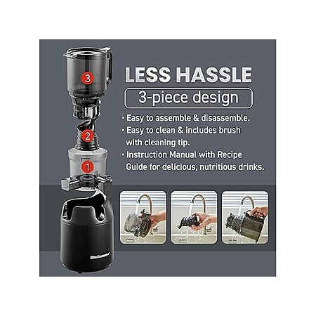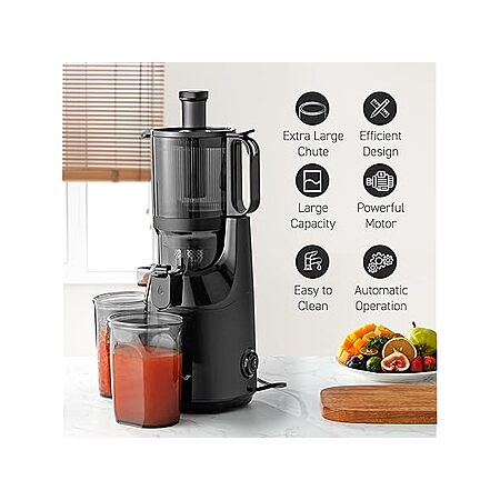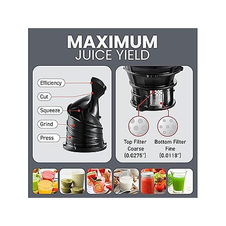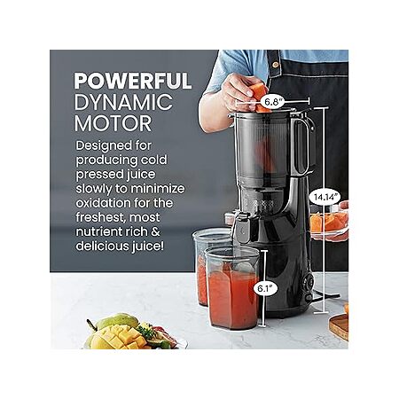- POWERFUL HIGH-TORQUE & LOW SPEED MOTOR: Quietly extracts more juice from fruits and vegetables than conventional juicers, resulting in a higher yield and less waste.