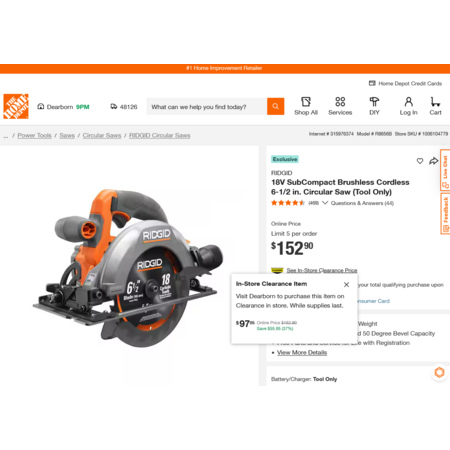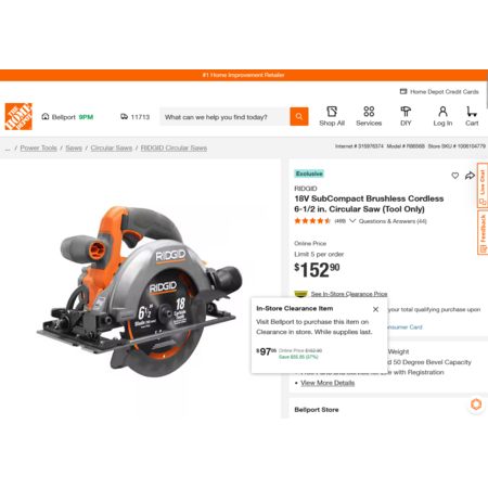 YMMV - Select Home Depot Stores: RIDGID 18V SubCompact Brushless Cordless 6-1/2 in. Circular Saw (Tool Only) $97.05