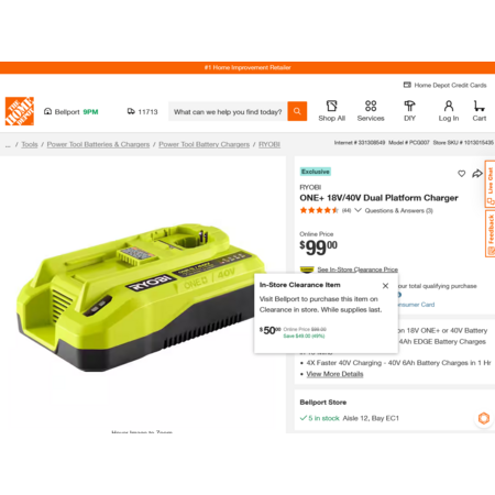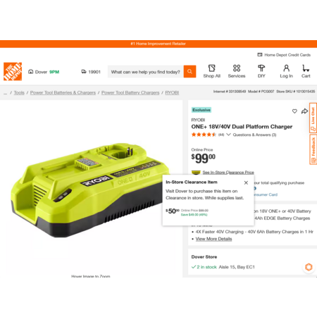 YMMV - Select Home Depot Stores: RYOBI ONE+ 18V/40V Dual Platform Charger. In-Store Clearance $50