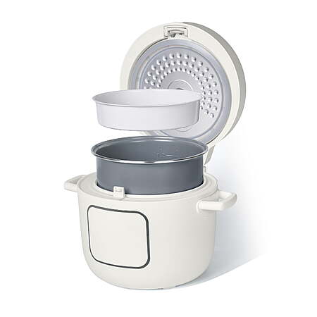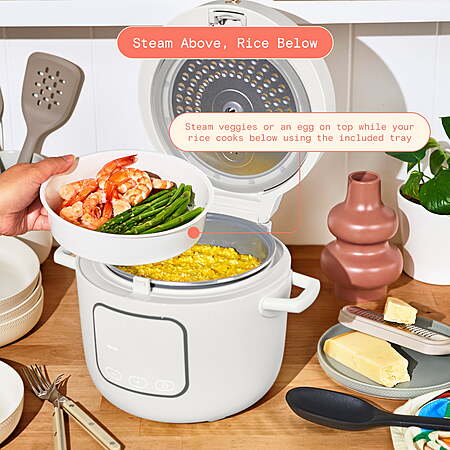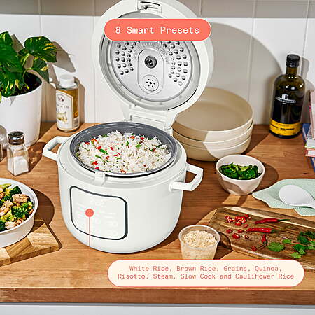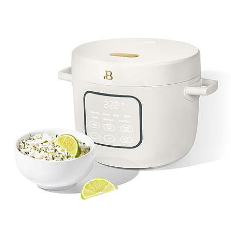 Because great meals start with great rice—unlock the full flavor of every grain. The Beautiful 14-Cup Rice & Grain Cooker by Drew Barrymore takes the guesswork out of rice-making with 8 presets and includes a rice measuring cup. From white rice to risotto, it delivers delicious results with a sleek, hinged lid and cooks up to 14 cups of fluffy rice. Bonus: add the included tray to the top of the pot to steam vibrant veggies or soft-boil an egg while your rice simmers underneath! Makes up to 14 cups of fluffy cooked rice, equivalent to 6 cups uncooked 8 presets for white rice, brown rice, grains, quinoa, risotto, steam, slow cook and cauliflower rice EverGood™ Ceramic Nonstick Coating with easy food release Hinged lid stays open for easy serving and transportation Automatic keep warm setting switches on and lasts up to 12hrs Fully programmable up to 24hrs in advance Steam veggies or an egg on top while your rice cooks below using the included tray Removable aluminum inner pot is non-stick and dishwasher-safe Cool-touch handles for easy portability Touch-activated display illuminates when needed Includes steamer/egg cooker tray, rice paddle and rice measuring cup