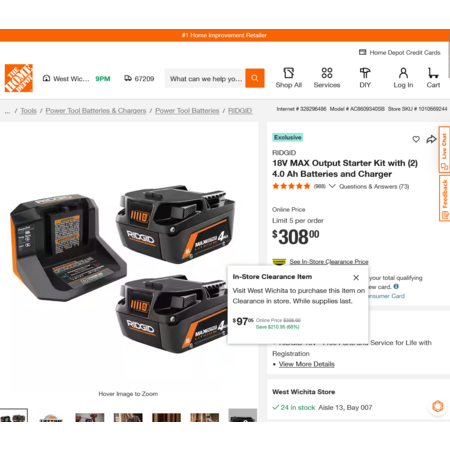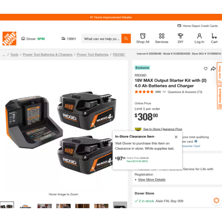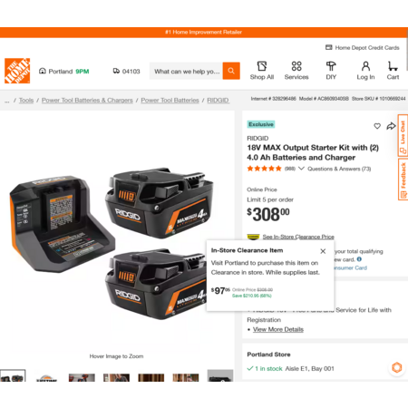 YMMV - Select Home Depot Stores: RIDGID 18V MAX Output Starter Kit with (2) 4.0 Ah Batteries and Charger. In-Store Clearance $97.05