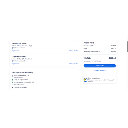 United Airlines, Delta Air Lines and Expedia have round trip airfares travelling from Phoenix (PHX) to Taipei Taiwan (TPE) for $586, making 1 quick stop both ways. These are basic economy fares that allows a personal item, a carry-on bag and 1 free checked bag on both carriers. There is no seat selection and no change.
