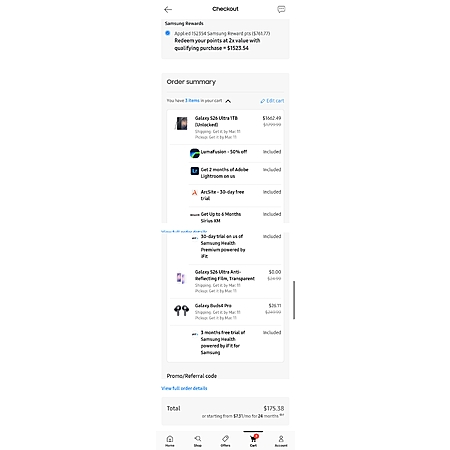 Overall paid $175.38-$50.65 = $124.73 for the 1TB S26 Ultra black as well as Buds4 pro black. This is the best deal I ever had on Samsung on my life and worth every penny!