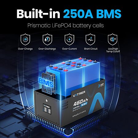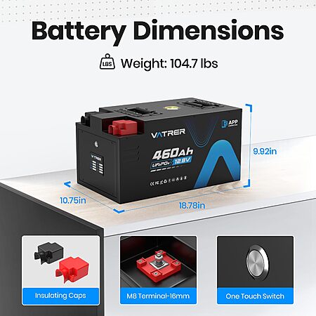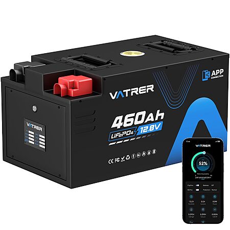 VATRER POWER 12.8V 460Ah Low Temp Cutoff LiFePO4 RV Battery, APP Monitoring, Built-in 250A BMS, Max. 3200W Load Power, 5880Wh Usable Energy $999.97