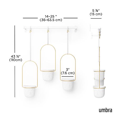 - DISPLAY PLANTS IN ANY WINDOW: By hanging 3 small planters on an extendable metal rod, Triflora makes it easy to water and display plants in your window without taking up space on the window sill ADJUSTS HORIZONTALLY AND VERTICALLY: Slide Triflora's three ropes along the metal rod and adjust their lengths to fully customize the placement of each hanging planter HOLDS STANDARD SIZE POTS: Triflora Hanging Planter features durable melamine planters that can hold standard 3-inch diameter pots; so, there's no need for re-potting ALL MOUNTING HARDWARE INCLUDED: Triflora comes with mounting hardware, fits any standard 24-inch window, and can be ceiling or wall-mounted; ideal for herbs, succulents, vines and more DESIGNED IN TORONTO: Based in Toronto, Canada, Umbra is a global leader in product design and currently distributes in over 120 countries across the world