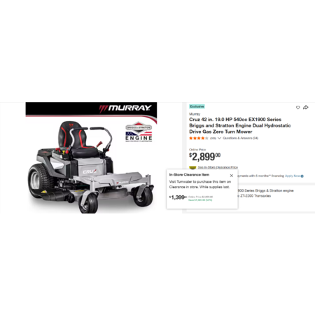 YMMV-Select Home Depot Stores: Murray Cruz 42 in. 19.0 HP 540cc EX1900 Series Briggs and Stratton Engine Dual Hydrostatic Drive Gas Zero Turn Mower. In-Store Clearance $1399