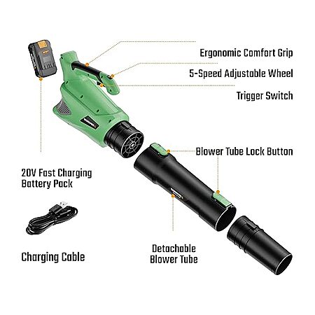 - Variable Speed Control: This cordless leaf blower features a variable speed trigger that gives you precise airflow adjustment with a single press. Apply gentle airflow for light-duty cleaning in gardens and flowerbeds, or pull the trigger fully to unleash maximum power for tough debris like wet, matted leaves. Say goodbye to wasteful energy use and hello to a more efficient way of clearing your outdoor spaces.