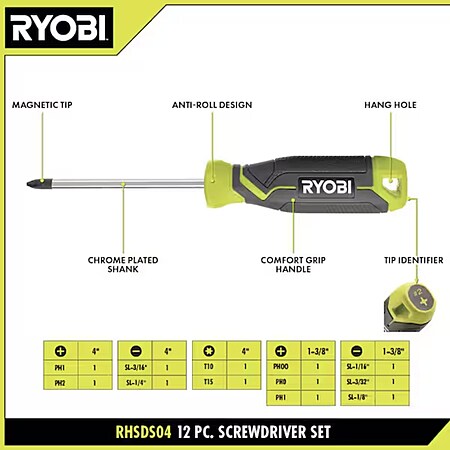 The RYOBI 12 PC. Screwdriver Set is designed with six full size screwdrivers as well as six precision screwdrivers for precise applications. The magnetic hold increases fastener retention. The tip identifier and anti-roll design aid in easy identification and keeping the screwdriver in place. This screwdriver is chrome plated for corrosion resistance. Stay organized with the included Precision Screwdriver Set case. Included is (1) PH00, (1) PH0, (2) PH1, (1) PH2, (1) SL-1/16 in., (1) SL-3/32 in., (1) SL-1/8 in., (1) SL-3/16 in., (1) SL-1/4 in., (1) T10.