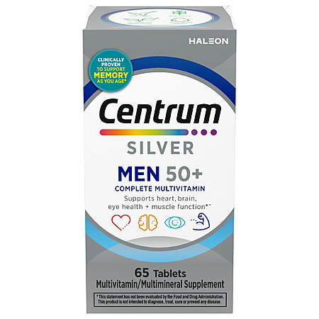 | Product Description: | Daily Multivitamins for Men 50 and Up Centrum Silver Multivitamins for Men Over 50 bring you a tailored multivitamin/multimineral supplement that contains micronutrients to help support full body wellness, complete from A to zinc (1). This daily multivitamin for men over 50 contains essential nutrients, including vitamin D and magnesium to help maintain muscle health, B Vitamins to help promote heart health, zinc to help support normal brain function, lutein and vitamins A, C, and E to support healthy eyes (1, 2, 3). Key micronutrients in these men's vitamins help fill in nutritional gaps to promote overall wellness and vitality (1). This senior multivitamin for men is a verified Non-GMO (4) and gluten free men's multivitamin to fit a variety of dietary preferences. Centrum Silver men's multivitamin tablets feature a smooth coating that makes these multivitamins for seniors easy to swallow. Simply take one of these senior men's vitamins daily to provide your body with key vitamins and minerals. Help support full body wellness (1) with Centrum, the number 1 doctor and pharmacist recommended brand. (1) These statements have not been evaluated by the Food and Drug Administration. This product is not intended to diagnose, treat, cure or prevent any disease. (2) Not a replacement for cholesterol-lowering drugs (3) This product is not intended to provide daily intake of lutein. Take with a diet rich in fruits and vegetables (4) Non-GMO applies to Centrum and Centrum Silver tablets only; learn more at Centrum's official website. ^Haleon does not Sell or Promote GLP-1s. Consult with HCP on GLP-1 and Centrum use. Use as directed. One 65 count bottle of Centrum Silver Multivitamin for Men 50 Plus, Multivitamin/Multimineral Supplement with Vitamin D3, B Vitamins and Zinc Multimineral multivitamins for men over 50 that are an ideal supplements for eye health, heart health, and brain health (1, 2) Senior multivitamins for men that contain micronutrients such as B Vitamins, Vitamin D3 and zinc that help support full body wellness (1, 2) Multimineral multivitamins for men 50 plus that help support immune health, bone health and muscle function with vitamin D (1) GLP-1 users: Balance your nutrient needs with Centrum for whole body health^ Brain health supplements are Non-GMO and gluten free (1, 3, 4) Eye health vitamins that come in easy-to-swallow tablets Take one of these men's vitamin tablets every day to provide nutrients to help support a healthy body (1) Medicare Advantage OTC (MAOTC) eligible. *OTC benefits and eligible products vary by plan. Check your plan for specific details. |