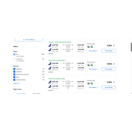 Icelandair via Booking.com have round trip airfares travelling from Boston (BOS) to Stockholm Sweden (ARN) for $389, making 1 stop in Iceland both ways for 1-10 hours so plan ahead. On Icelandair, your low economy light airfare only allow a personal item and a carry-on bag.