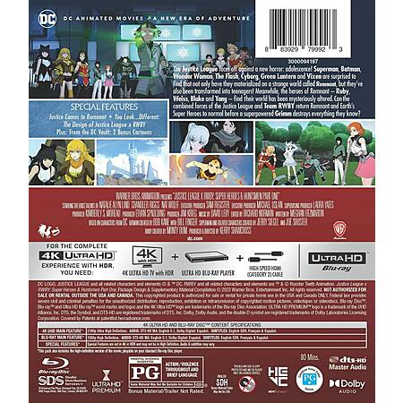 Inexplicably, Superman, Batman, Wonder Woman, Flash, Green Lantern, Cyborg, and Vixen found themselves transported to the otherworldly realm of Remnant-and turned into teenagers! Finding allies in Ruby, Weiss, Blake, and Yang, will their combined abilities be enough to deal with the emergence of a breed of the monsters called Grimm more powerful than the Huntresses have ever faced? Anime-flavored crossover event features the voices of Nat Wolff, Chandler Riggs, Natalie Alyn Lind. 72 min. Widescreen; Soundtrack English; Subtitles English; featurettes.