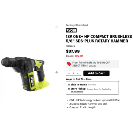 RYOBI 18V ONE+ HP Compact Brushless 5/8" SDS-Plus Rotary Hammer (PSBRH01B) Tool Only. Factory Blemished. $5 Shipping. $87.99