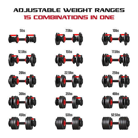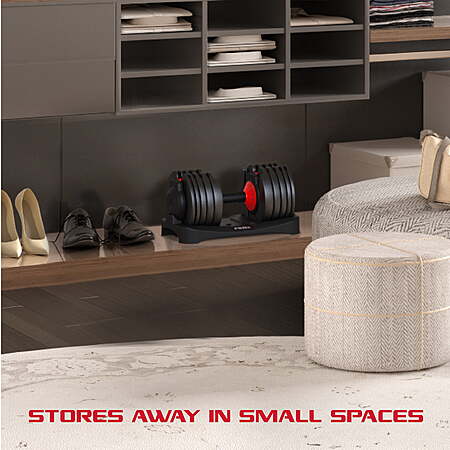 | Product Description: | Maximize your strength training with minimal equipment using the FitRx SmartBells Set! These adjustable dumbbells let you customize each SmartBell’s weight in increments ranging from 5 to 52.5 lbs. The simple one-handed quick-select design makes them easy to use: just grip the handle and rotate it towards your desired weight. They also feature an anti-slip handle and safety lock for a more secure and seamless workout. The space-saving design comes with a durable storage rack that fits perfectly anywhere in your home and holds plates when they’re not in use. Increase the weight as your strength grows and get the results you want with the FitRx SmartBells Set! • Two adjustable dumbbells • One-handed weight adjustment for convenient, simple functionality • Each includes 10 plates with 15 different weight configurations: 5, 7.5, 10, 12.5, 15, 17.5, 20, 22.5, 25, 30, 35, 40, 45, 50, and 52.5 lbs. • Anti-slip handle and safety lock to keep plates secure during your workout • The perfect addition to any home gym • Easy wipe-down maintenance • Compact design with durable storage rack 125% FitRx SmartBell, Quick Select Adjustable Dumbbell, 5-52.5 Lb. One-handed weight adjustment for convenient, simple functionality 10 plates with 15 different weight configurations: 5, 7.5, 10, 12.5, 15, 17.5, 20, 22.5, 25, 30, 35, 40, 45, 50, and 52.5 lbs. Anti-slip handle and safety lock to keep plates secure during your workout The perfect addition to any home gym Easy wipe-down maintenance Compact design with durable storage rack |