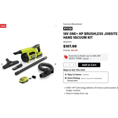 RYOBI 18V ONE+ HP Brushless Jobsite Hand Vacuum Kit (PBLHV701K ) Factory Blemished. $5 Shipping. $107.99
