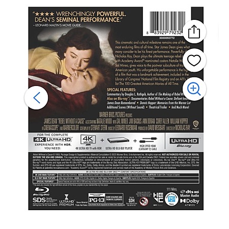 After moving to a new town, troublemaking teen Jim Stark (James Dean) is supposed to have a clean slate, although being the new kid in town brings its own problems. While searching for some stability, Stark forms a bond with a disturbed classmate, Plato (Sal Mineo), and falls for local girl Judy (Natalie Wood). However, Judy is the girlfriend of neighborhood tough, Buzz (Corey Allen). When Buzz violently confronts Jim and challenges him to a drag race, the new kid's real troubles begin. Rebel Without A Cause (4K Ultra HD + Blu-ray) Drama Not Rated 4K Ultra HD™ Warner Bros.