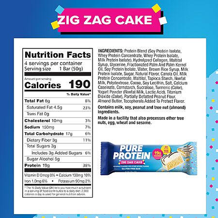 Model: Pure Protein Zig Zag Cake Protein Bars – 19g Protein, 3g Sugar, 190 Calories (4 count) Low Sugar* High Protein Snack - Gluten Free - Perfect for a Healthy Snack.