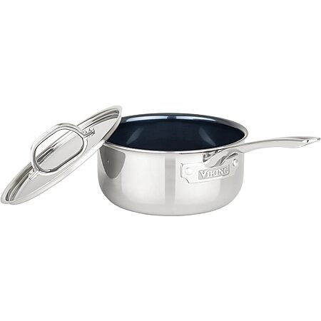 Viking 4-Ply Sauce Pan with Lid, 3 Quart Laser Clad Titanium Performance Ti Saucepan Cooking Pot, Dishwasher and Oven Safe, Induction Ready, Blue/Silver