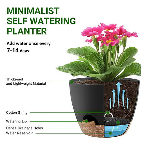 | Product Description: | The FOUKUS Set of 5 Self-Watering Plant Pots features built-in drainage holes and water reservoir trays that maintain optimal moisture levels. This self-watering system helps prevent overwatering and root rot, making plant care easier and more efficient for succulents, cacti, snake plants, and other indoor and outdoor plants. Perfect for indoor and outdoor use, these eco-friendly plastic planters are ideal for homes, offices, patios, balconies, and gardens. The set includes five different sizes (7", 6.5", 6", 5.5", and 5") to accommodate a variety of small to medium plants and versatile gardening needs. Designed with a modern minimalist style, these durable plastic pots bring natural vitality and enhance the aesthetic of any space. Sustainable and long-lasting, they support environmentally conscious gardening while adding a fresh look to your plant collection. Self-Watering Planters with Drainage: Each planter includes drainage holes to prevent waterlogging and a built-in tray that acts as a water reservoir, maintaining consistent moisture levels, reducing watering frequency, and promoting healthy root development. Indoor & Outdoor Plant Pots: Ideal for a variety of plants including succulents, cacti, snake plants, herbs, and flowers. Suitable for use in homes, offices, patios, balconies, and gardens. Multiple Pot Sizes Included: The set includes five pots in graduated sizes (7", 6.5", 6", 5.5", and 5") to accommodate different small to medium plants and provide flexible planting options. Modern Minimalist Design: Featuring a sleek, minimalist style, these planters bring natural energy and vitality to any indoor or outdoor environment, enhancing the aesthetic appeal of your home or garden. Eco-Friendly Durable Plastic: Constructed from sustainable, durable plastic materials, these planters support environmentally conscious gardening and offer long-lasting performance. |