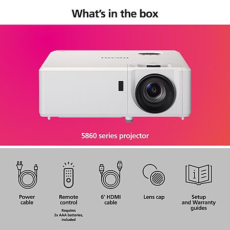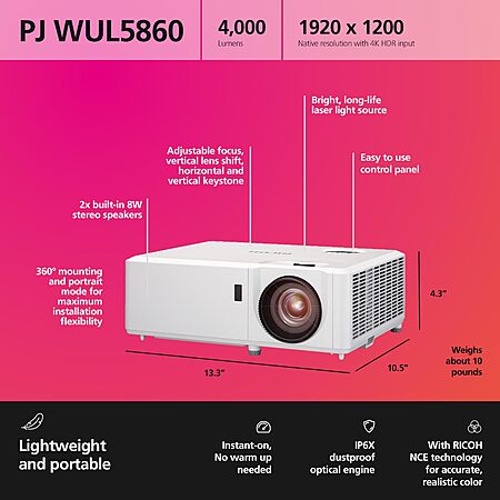 RICOH PJ WUL5860 Compact DLP Laser Projector | Bright 4,000 Lumens | Standard Throw | 29-303" Screen Size | Up to 20k hours | 2x 8W Stereo Speakers | 2x HDMI $529.37