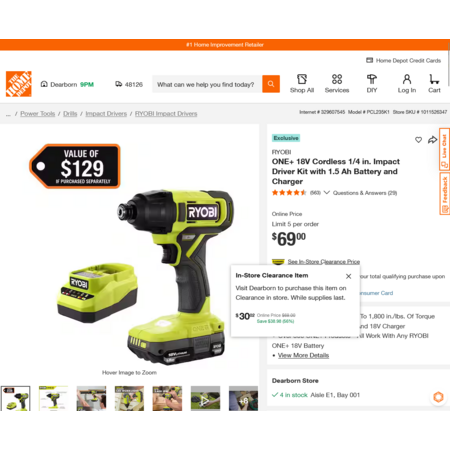 YMMV - Select Home Depot Stores: RYOBI ONE+ 18V Cordless 1/4 in. Impact Driver Kit with 1.5 Ah Battery and Charger. In-Store Clearance $30.02