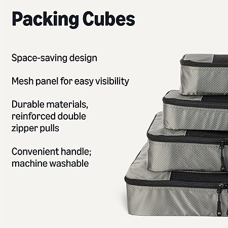 Model: Amazon Basics Lightweight Packing Cubes Travel Organizer Set with Double Zipper, Mesh Top, Multiple Sizes, 4 Piece, Gray