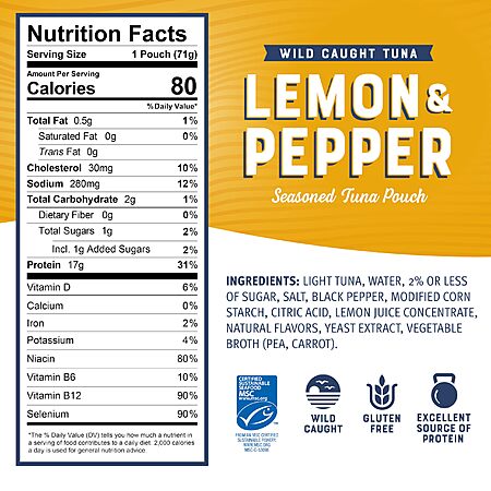 Model: Bumble Bee Lemon & Pepper Seasoned Tuna, 2.5 oz Pouch - Ready to Eat - Wild Caught Tuna Packet - 17g Protein per Serving - Gluten Free