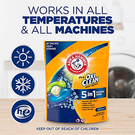 | Product Description: | Capture the cleaning power of ARM & HAMMER plus OxiClean five-in-one concentrated laundry detergent Power Paks with an amazing Fresh Scent. ARM & HAMMER Plus OxiClean stain-fighting laundry detergent delivers five powerful cleaning benefits in one: attacks more than 100 stains, fights odor, whitens whites, brightens colors, and freshens with an active scent boost. Everyday stubborn stains like food, dirt, and grime are no match for this HE laundry detergent. This powerful, concentrated stain remover for clothes comes in convenient, pre-measured Power Paks that force out dirt and odors with OxiClean, America's number-1 stain remover additive brand.(1) So there’s no measuring, no mess and no spills. Super easy, super powerful: use one pak for regular or lightly soiled loads, and two paks for large or heavily soiled loads. This concentrated laundry stain remover cleans in all temperatures, and works in both standard and high efficiency (HE) washing machines. Drop a pak or two in your washer to give your clothes an ARM & HAMMER Plus OxiClean clean today! (1)based on units sold One 42 count bag of ARM & HAMMER Plus OxiClean 5-in-1 concentrated laundry detergent Power Paks with an amazing Fresh Scent 5 cleaning benefits in 1; this concentrated laundry stain remover has 5-in-1 power that gets rid of 100+ stains, fights odors, whitens and brightens: with a boost of Fresh Scent fragrance that leaves your laundry smelling clean and fresh A deep cleaning ARM & HAMMER laundry detergent; concentrated ARM & HAMMER Plus OxiClean laundry detergent delivers powerful cleaning and lasting freshness in convenient pak form Removes 100+ laundry stains with the power of OxiClean plus the cleaning power you know and trust from ARM & HAMMER; this concentrated stain remover for clothes powers out dirt to deliver a deep clean Harness the power of OxiClean; don't let everyday stains ruin your clothes; this laundry stain remover attacks tough stains like food stains, grass, mud, oil, grime, and more No measuring, no mess, no spills; these convenient pre-measured Power Paks combine ultra-concentrated HE laundry detergent with OxiClean stain fighters in a drop-and-go laundry Power Pak Easy dosing for any load size; use two Power Paks for large or heavily soiled loads, and one Power Pak for regular or lightly soiled loads; this high efficiency laundry detergent ensures efficient and effective cleaning and freshening |