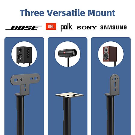 - 【Universal Speaker Brands Friendly】 Equipped with three key mounts - Top plates(with pads), L-shaped brackets, and Dual brackets, think of the surround sound speaker stand as a universal remote for most satellite speakers and small bookshelf speakers from Klipsch, Polk, JBL, Sony, Vizio, Edifier, and more. Versatile mounting options for theater setup.