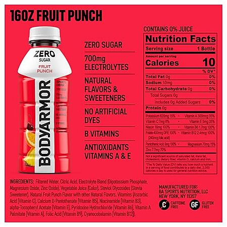 Amazon [amazon.com] has 12-Pack 16-Oz BODYARMOR ZERO Sugar Sports Drink (Fruit Punch) 4 for $43.20 - $10 (multibuy discount) - 5% when you check out via Subscribe & Save = $31.04.