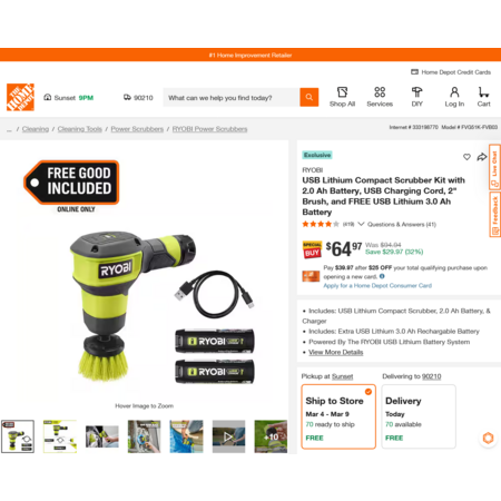 RYOBI USB Lithium Compact Scrubber Kit with 2.0 Ah Battery, USB Charging Cord, 2" Brush, and FREE USB Lithium 3.0 Ah Battery $64.97