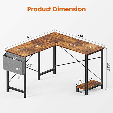 | Product Description: | Looking for a versatile and practical desk that fits perfectly into your small or large space? Look no further than our modern L-shaped computer desk with a reversible storage shelf and cloth bag! This desk is perfect for the home, office, gaming, writing, or studying, thanks to its ergonomic and spacious design. It features a unique L-shape that allows it to fit perfectly into most spaces and comes with a reversible storage shelf that can be fixed on the left or right side, depending on your preference. With a large desktop space and sturdy frame, this desk can hold all of your office equipment, including a computer screen, laptop, desktop audio, keyboard, printer, and mini plant, thanks to its maximum load of 200lbs. What's more, this computer desk comes with a reversible CPU stand that can be flipped to either side, and a well-made side storage bag that helps you organize files, books, magazines, and other small items. The desk is easy to assemble and takes only 20 minutes to complete with two persons, and can be cleaned easily with a damp cloth and mild detergent. This desk is suitable for both small and large spaces, and can be placed in most locations, such as the bedroom, living room, study room, office, or playroom. It's a great gift idea for your friends, family, or colleagues, and will bring them a unique and practical lifestyle. So why wait? Get your modern L-shaped computer desk today and start enjoying a comfortable, efficient, and stylish work or gaming environment! [Ergonomic and Comfortable Design] - Our L-shaped corner desk features a curved edge design that reduces fatigue and fits your arm and wrist perfectly, offering a comfortable work experience even for long hours. [Versatile Usage Options] - Not just for office work, this two-way coner desk is perfect for gaming, writing, and studying. It can serve as a computer desk, writing desk, or corner desk, providing versatility to meet your needs. [Ample Legroom and Stability] - With wide legroom, this study desk ensures a comfortable sitting posture and stability on uneven floors, allowing you to stretch and move your legs freely. [Efficient Storage Solutions] - The L-shaped desk comes with a storage pocket for organizing books, documents, and essentials, as well as a bottom shelf for storing CPUs, printers, and office equipment, keeping your workspace clutter-free. [Easy Assembly] - Enjoy hassle-free setup with our L-shaped corner desk, designed for easy assembly and convenience. We are dedicated to providing high-quality products and excellent customer service. |