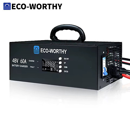 The ECO-WORTHY 48V 60A Charger offers fully adjustable charging—0–60A at 240V and 0–30A at 120V—allowing you to fine-tune both charging voltage (32–64V) and charging current to match your battery system and power source