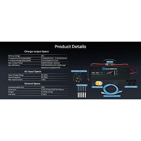 Power Without the Hassle With its compact design, intuitive LCD display, and easy-to-use controls, the 48V 60A Charger is ideal for both beginners and advanced users. Installation is simple and secure thanks to the included sturdy wall-mount bracket