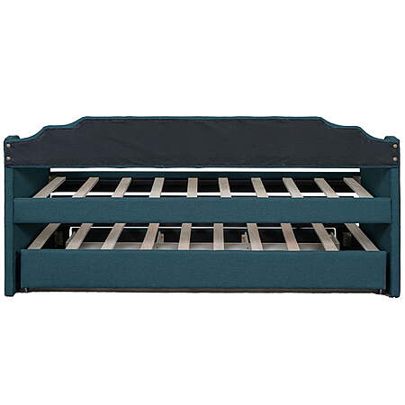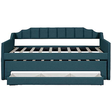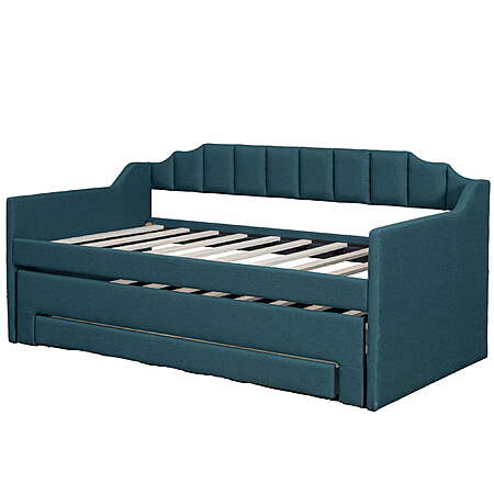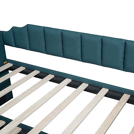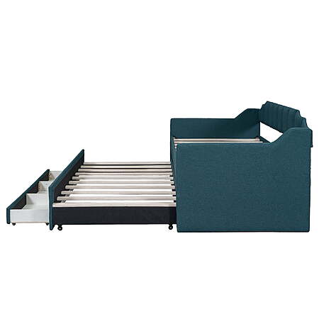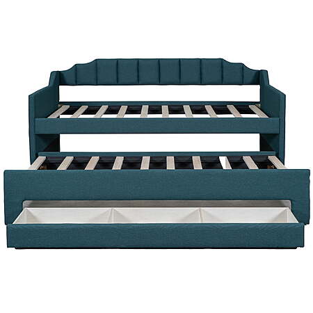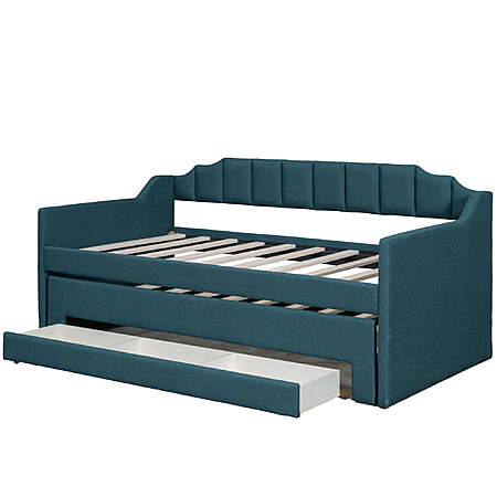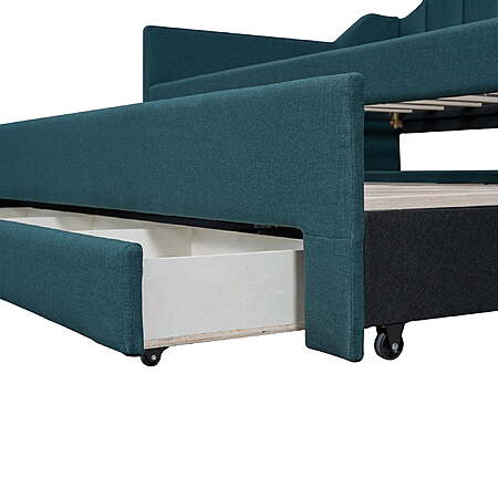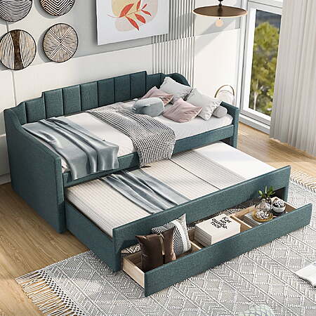 | Product Description: | Our twin size upholstery daybed offers a functional and trendy design for all families. This wood storage twin bed could be an excellent option for a bedroom, dorm, or child's room. A hidden pull-out bed and large drawers can improve space utilization while providing additional rest space, which makes it ideal for small families or families with multiple children. The multifunctional design and the variety of colors to choose from can't help but impress. EUROCO twin bed is impossible to resist. The upholstery turfed back will be soft for you to lean when you are reading or watching. Features: [Large Storage Space]: Our twin size daybed is designed with a twin size trundle under the bed to provide extra sleeping space for guests. In addition, there are 3 large storage drawers for you to store daily necessities, books or toys. [Multifunctional Dual-use Design]: This trundle bed with storage perfectly combines the functions of a wooden bed and sofa and fully improves space utilization. Simple shape can perfectly complement the existing decoration style. Children and guests can sit on it, read books, play games, or lie down and rest. [Practical Twin Bed]: Our modern and stylish twin trundle bed can be perfectly matched with different decor styles or furniture. The non-toxic and odorless upholstery design on the surface will not harm the health of you or your family and can be used with confidence. [Stable Structure]: In order to improve the overall stability and durability of this kids twin bed with trundle and storage, we have carefully selected high-quality wood to ensure safety of kids. Wooden slat supports provide users with strong support for quality sleep. [Easy to Assemble]: Without requirements of box springs, our twin trundle bed is easy to assemble. Detailed instructions and complete accessories can help you accurately complete the entire assembly process. Specification: Size: Twin Overall Product Dimension: 80.3"L*94.9"W*37.6"H Dimension of the Daybed: 75"x 39" Dimension of the Trundle Bed: 74.4"x 39" Overall Product Weight: 150lb Bed Weight Capacity: 250lb Mattress Included: No Total Height: 37.6" Assembly Required: Yes Recommend Bed Mattress Thickness: 6'' Features: [Large Storage Space]: Our twin size daybed is designed with a twin size trundle under the bed to provide extra sleeping space for guests. In addition, there are 3 large storage drawers for you to store daily necessities, books or toys. [Multifunctional Dual-use Design]: This trundle bed with storage perfectly combines the functions of a wooden bed and sofa and fully improves space utilization. Simple shape can perfectly complement the existing decoration style. Children and guests can sit on it, read books, play games, or lie down and rest. [Practical Twin Bed]: Our modern and stylish twin trundle bed can be perfectly matched with different decor styles or furniture. The non-toxic and odorless upholstery design on the surface will not harm the health of you or your family and can be used with confidence. [Stable Structure]: In order to improve the overall stability and durability of this kids twin bed with trundle and storage, we have carefully selected high-quality wood to ensure safety of kids. Wooden slat supports provide users with strong support for quality sleep. [Easy to Assemble]: Without requirements of box springs, our twin trundle bed is easy to assemble. Detailed instructions and complete accessories can help you accurately complete the entire assembly process. Specification: Size: Twin Overall Product Dimension: 80.3"L*94.9"W*37.6"H Dimension of the Daybed: 75"x 39" Dimension of the Trundle Bed: 74.4"x 39" Overall Product Weight: 150lb Bed Weight Capacity: 250lb Mattress Included: No Total Height: 37.6" Assembly Required: Yes Recommend Bed Mattress Thickness: 6'' Daybed with trundle and drawers 2 beds in one sofa bed |